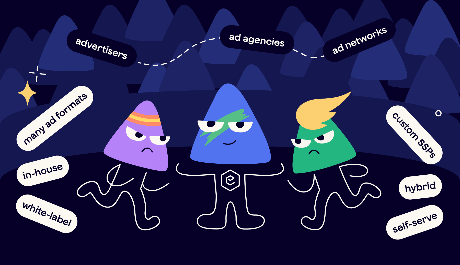 - Bonus: push, pop, rewarded video, HTML5, audio ads,