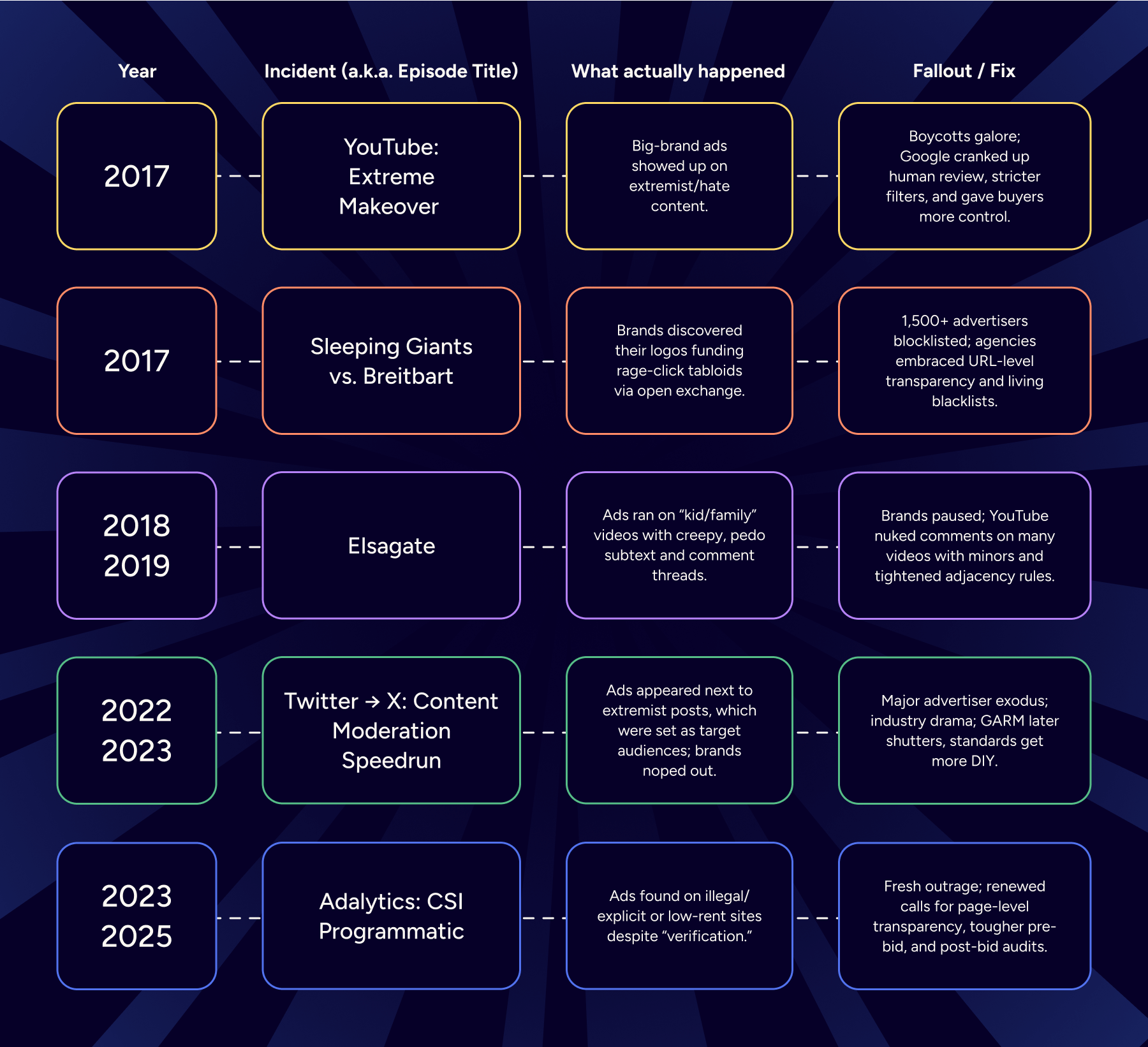 These categories, such as adult content, hate speech, extreme violence, piracy, and so on, delineate what content is off-limits for any advertising. Then, verification tech refined these definitions and built algorithms to assure brands that such content is defined automatically.